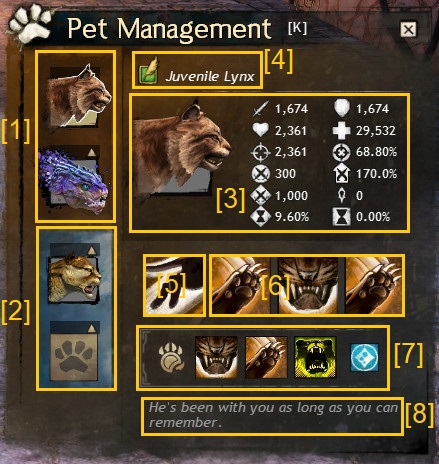 Apertando a tecla K ou clicando com o Botão esquerdo do Mouse na foto do Pet, é possível abrir a janela de Pet Management, lá é possível ver quais Pets você tem disponível, quais deles você equipou, seus atributos e suas habilidades: