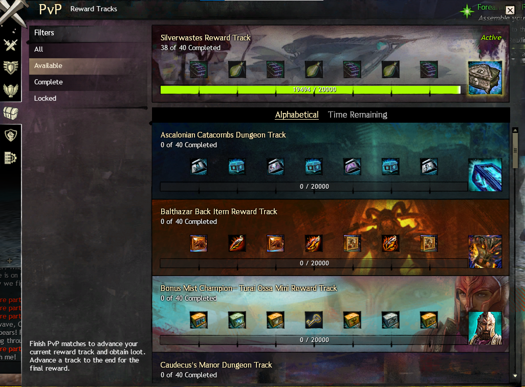 O WvW tambem tem a sua própria Reward Track, diferente da do PvP e além disso, possui uma arvore de habilidades que são treinadas apenas no WvW, estas habilidades ajuda o jogador a ter novas ferramentas dentro do modo de jogo, assim como certas vantagens entra npc’s e estruturas.