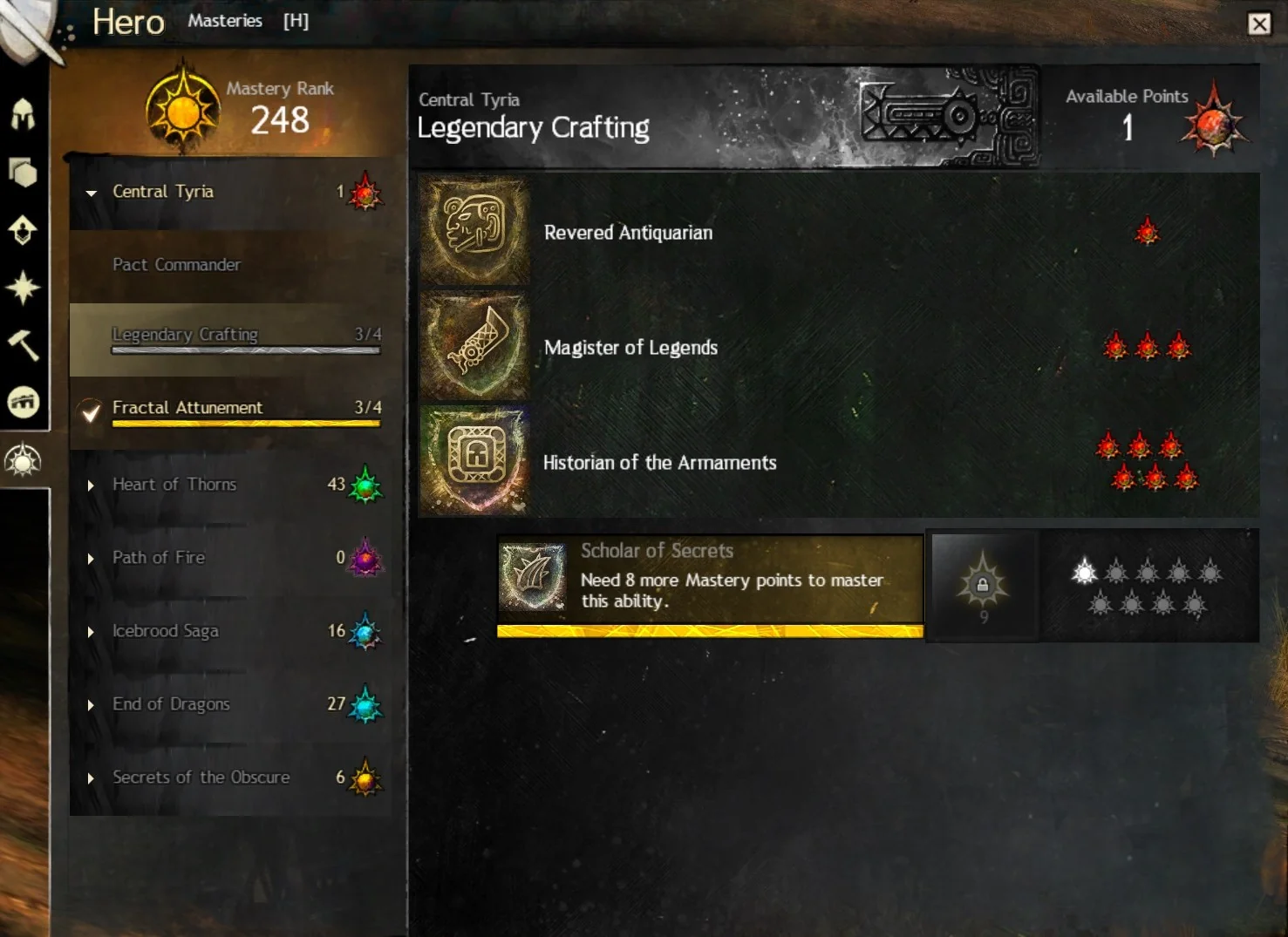 Dentro de cada categoria de expansão, cada uma tem varias Masteries, como ao exemplo a baixo, na categoria Central Tyria, há 3 Masteries para serem treinadas: “Pact Commander, Legendary Crafting e Fractal Attunement”, cada uma tem vários níveis e vão melhorando coisas diferentes.